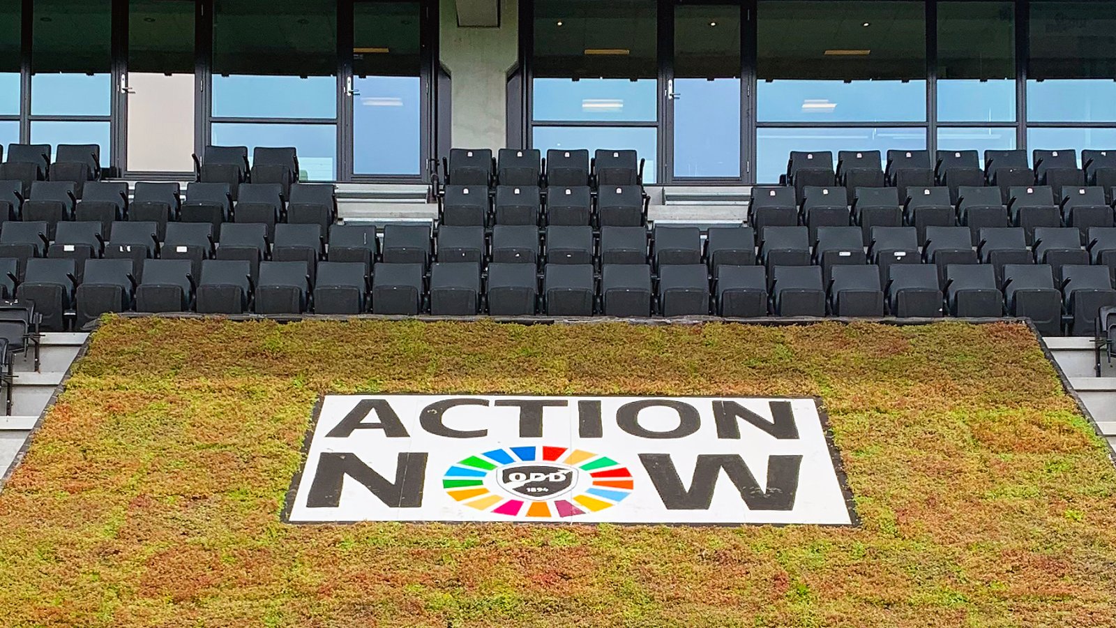 Odds Ballklubb har nettopp satt opp et segl av sedum-planter på tribunen med en logo i tre som det er malt Action Now på.