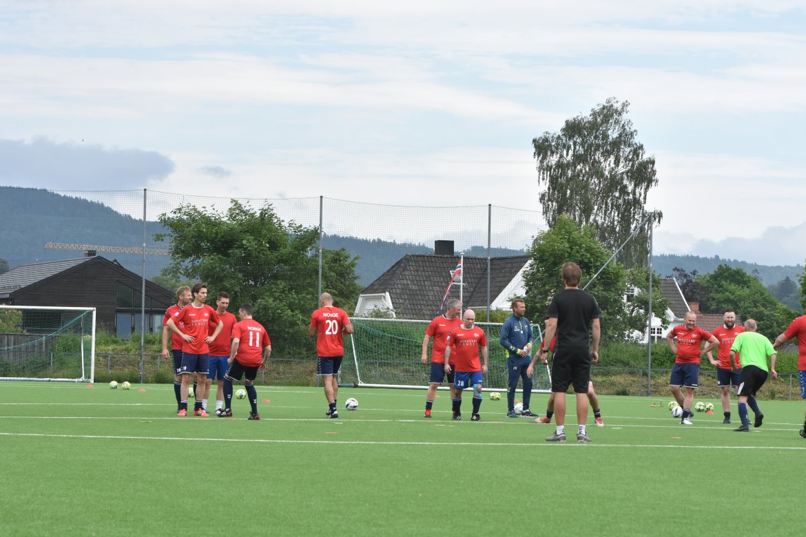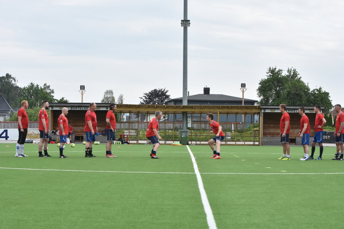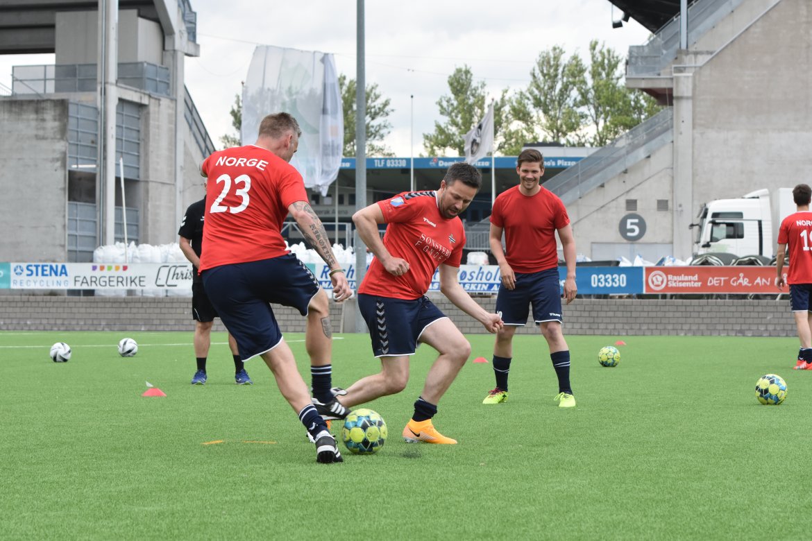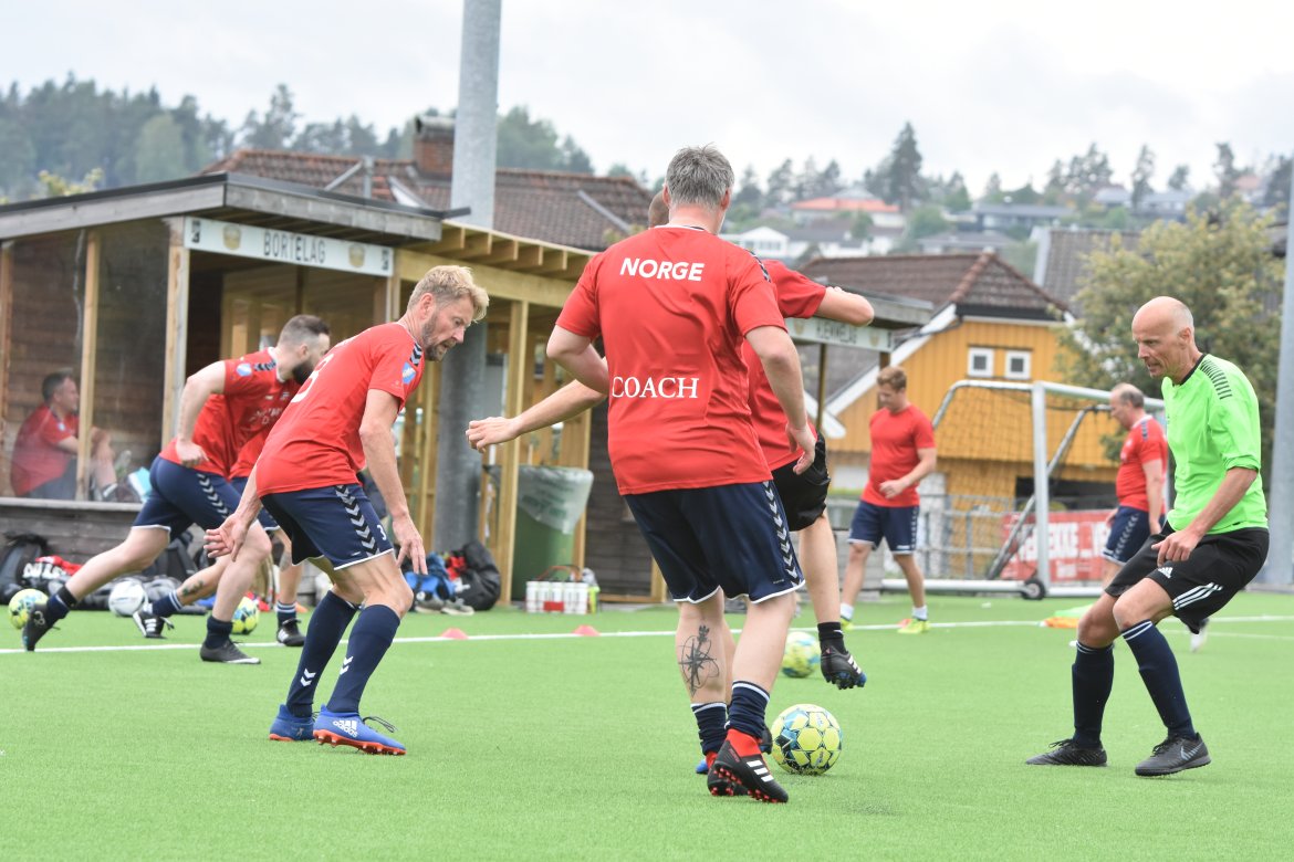 Allerede torsdag 10. juni hadde de sin første økt på et rykende ferskt kunstgress. Det var Jan Frode Nornes som ledet veteranene gjennom sin første økt på samlingen. Gutta, som er vant med å gi alt for Norge, gir ikke mindre under trening når eliteserietreneren formaner dem under en hard treningsøkt på treningsbanen på Skagerak Arena.