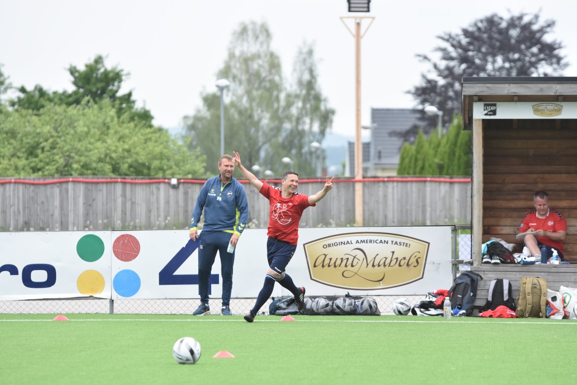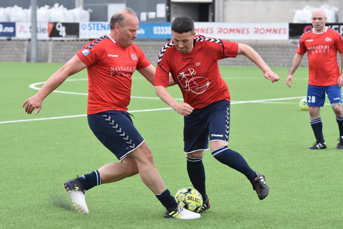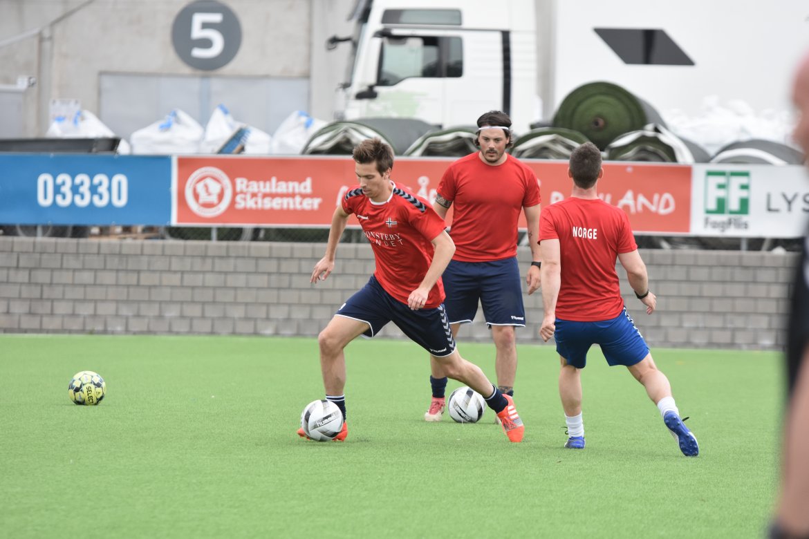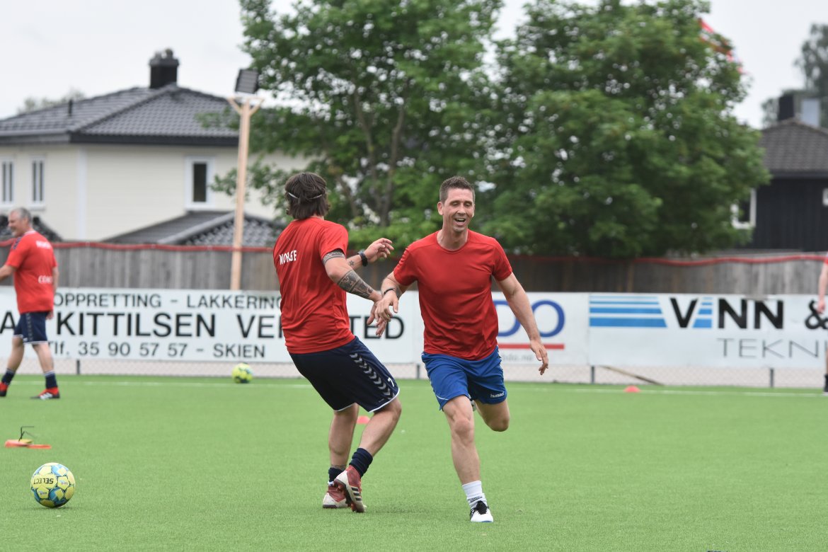 Allerede torsdag 10. juni hadde de sin første økt på et rykende ferskt kunstgress. Det var Jan Frode Nornes som ledet veteranene gjennom sin første økt på samlingen. Gutta, som er vant med å gi alt for Norge, gir ikke mindre under trening når eliteserietreneren formaner dem under en hard treningsøkt på treningsbanen på Skagerak Arena.