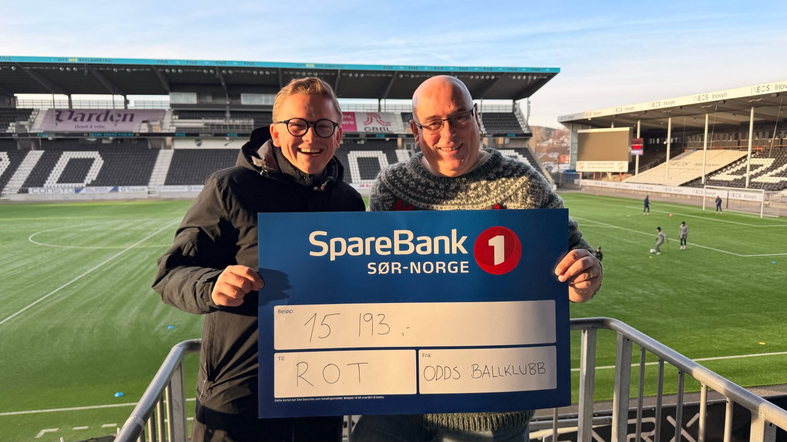 I forbindelse med opprykkskampene på Skagerak Arena gikk en andel av billettinntektene til Odd. Denne summen – 15 193 kroner – valgte vi å gi videre til R.O.T., en bruker- og pårørendeorganisasjon innen avhengighet, drevet av ildsjelen Emil Sølyst.