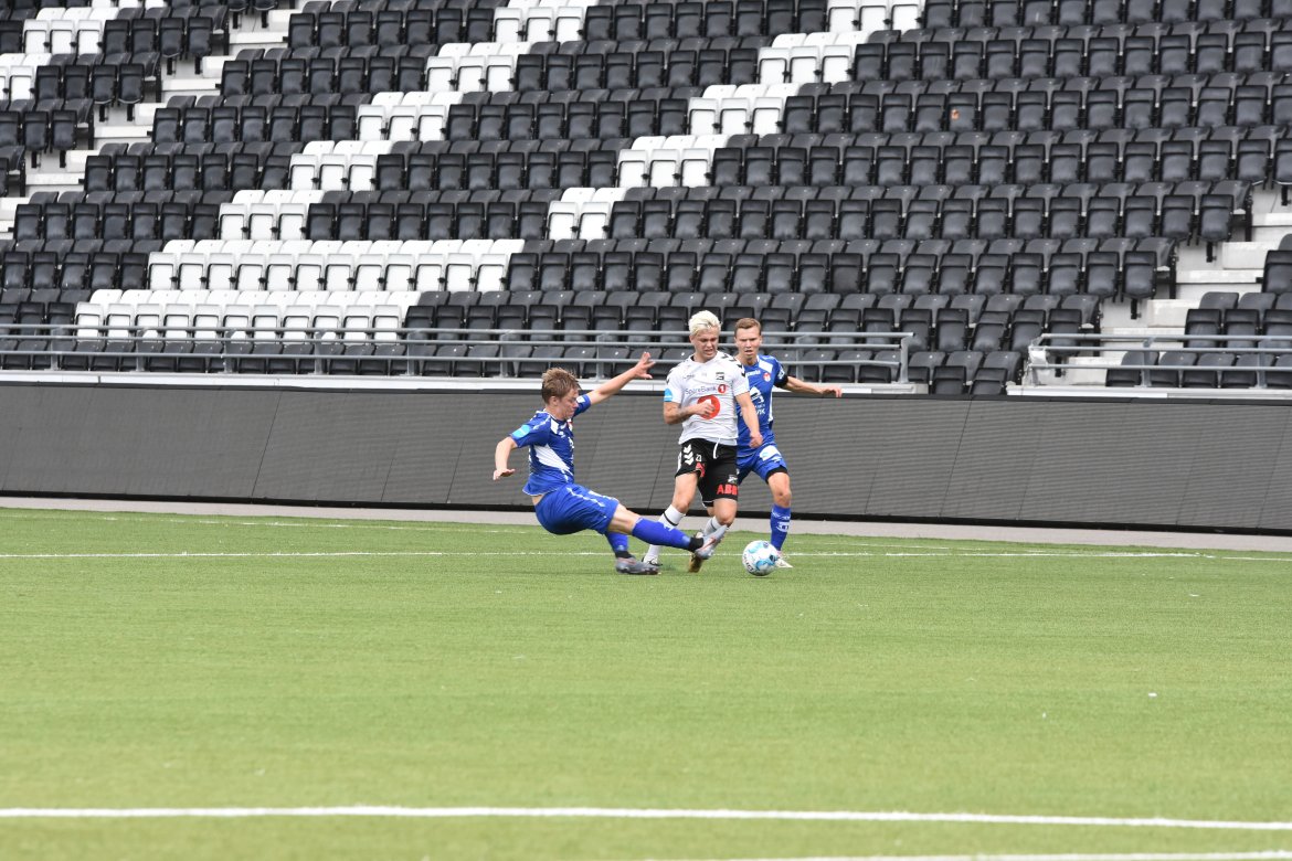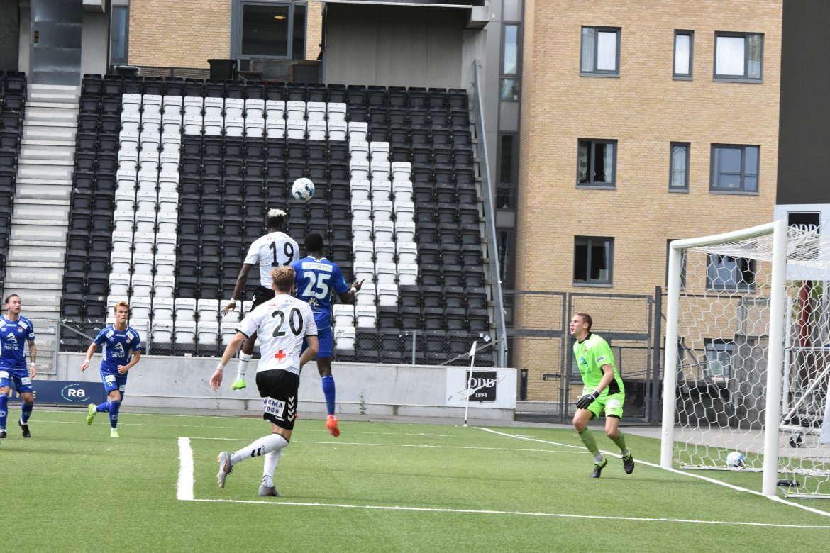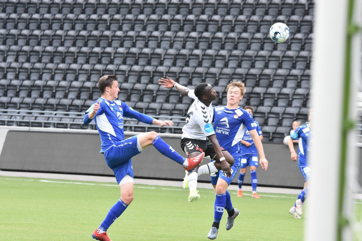 Etter snaue 25 minutter kom kampens tredje scoring. Odd vartet opp med herlige kombinasjoner på bortelagets halvdel. Til slutt var det venstrebacken, Marius Larsen, som pisket ballen i boksen. På bakerste stolpe dukket Tobias Lauritsen opp og headet ballen, dog ikke i mål. Lauritsen tok nemlig på seg hovmesterfrakken og serverte Joshua Kitolano, som hadde en enkel oppgave med å heade ballen inn i åpent mål.