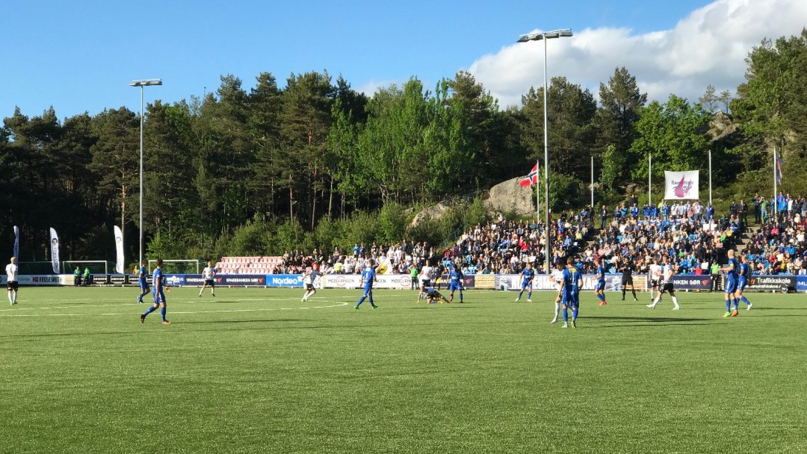 Gutta har fått tid til å drikke og eventuelt spise i pausa. Det kan være en fordel i og med at sola skinner over Flekkerøya. Stadion ligger idyllisk plassert på Flekkerøya, og du kan se folk som sitter på fjellknauser og nyter vafler i sola. Fagermo er nok gira på å drepe denne kampen så tidlig som mulig for å kunne få best mulig oppladning til den viktige kampen mot Brann på søndag.