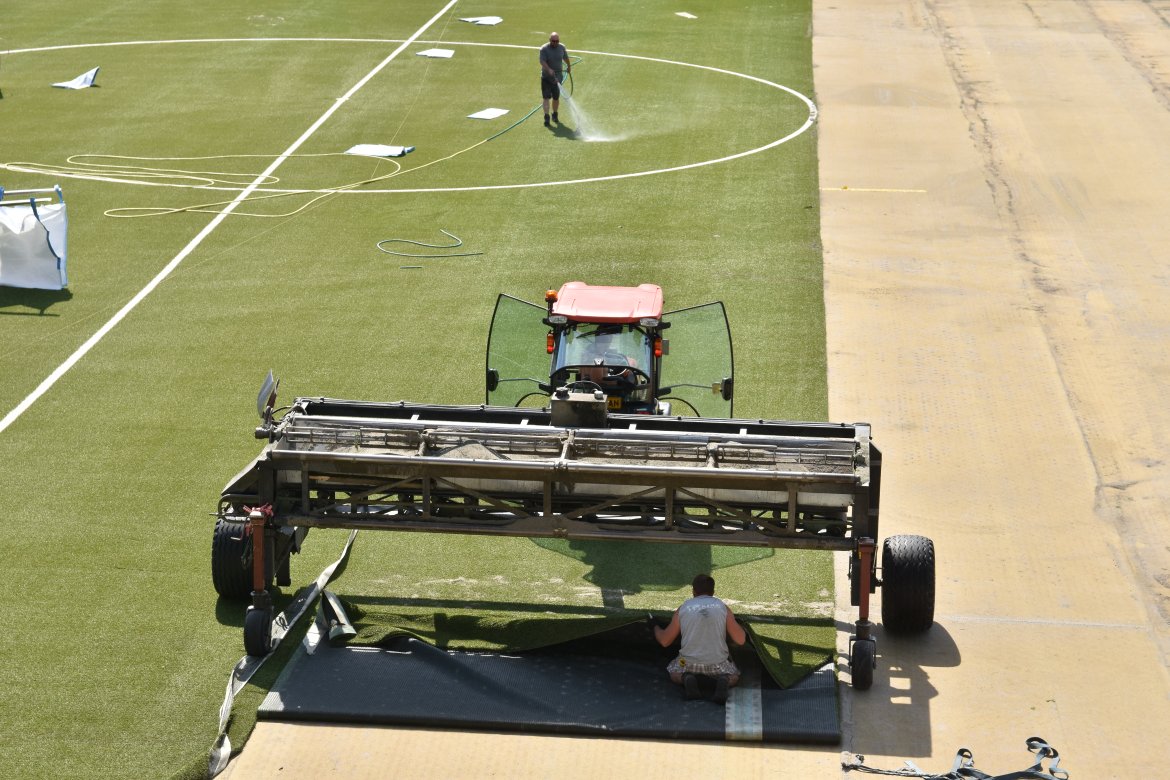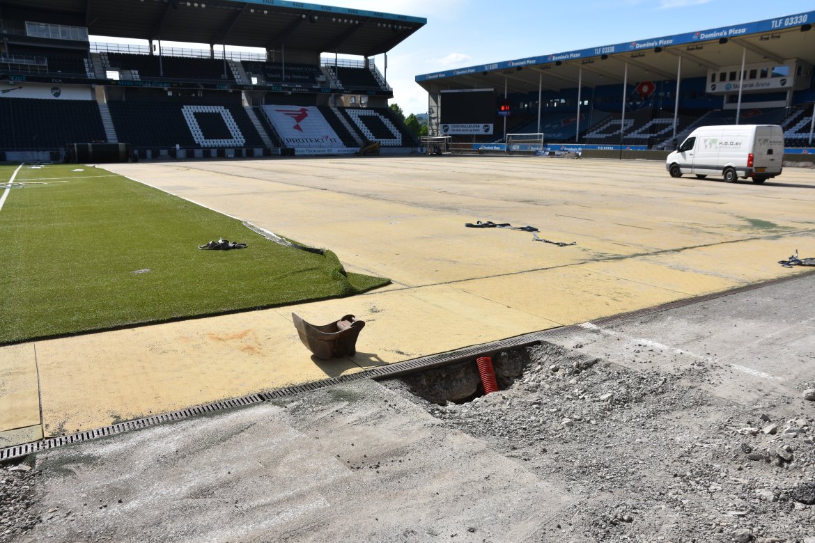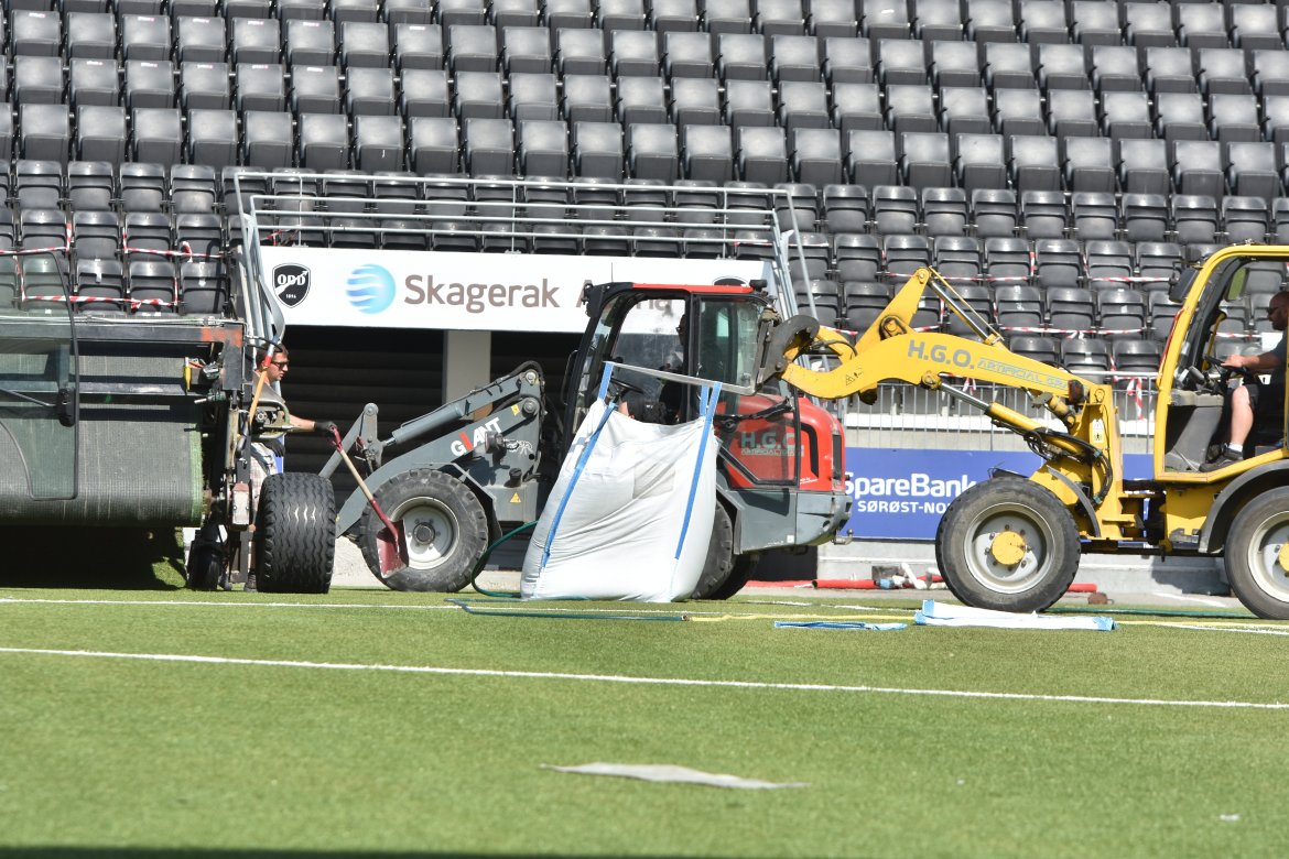 Her kan du se bilder fra utskiftningen av kunstgresset på Skagerak Arena Bildegalleri